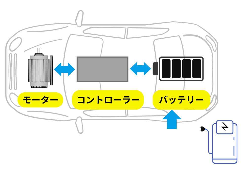 電気自動車(EV)は、バッテリーにためた電気でモーターを動かすという、 とてもシンプルな仕組みの車です。