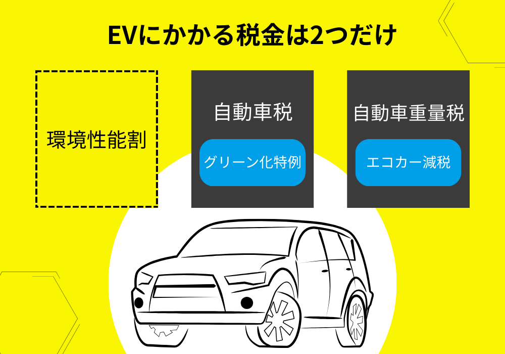 購入時にかかる「環境性能割」は、EVであれば非課税(0円)となるため、実質的に3つの税金のうち2つのみを考えれば良いことになります。