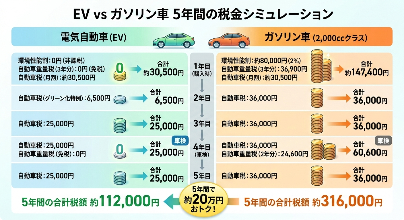「本来払うべき3つの税金のうち、1つは全額カット、残り2つも大幅割引」という点が、EVならではの強力なメリットといえます。